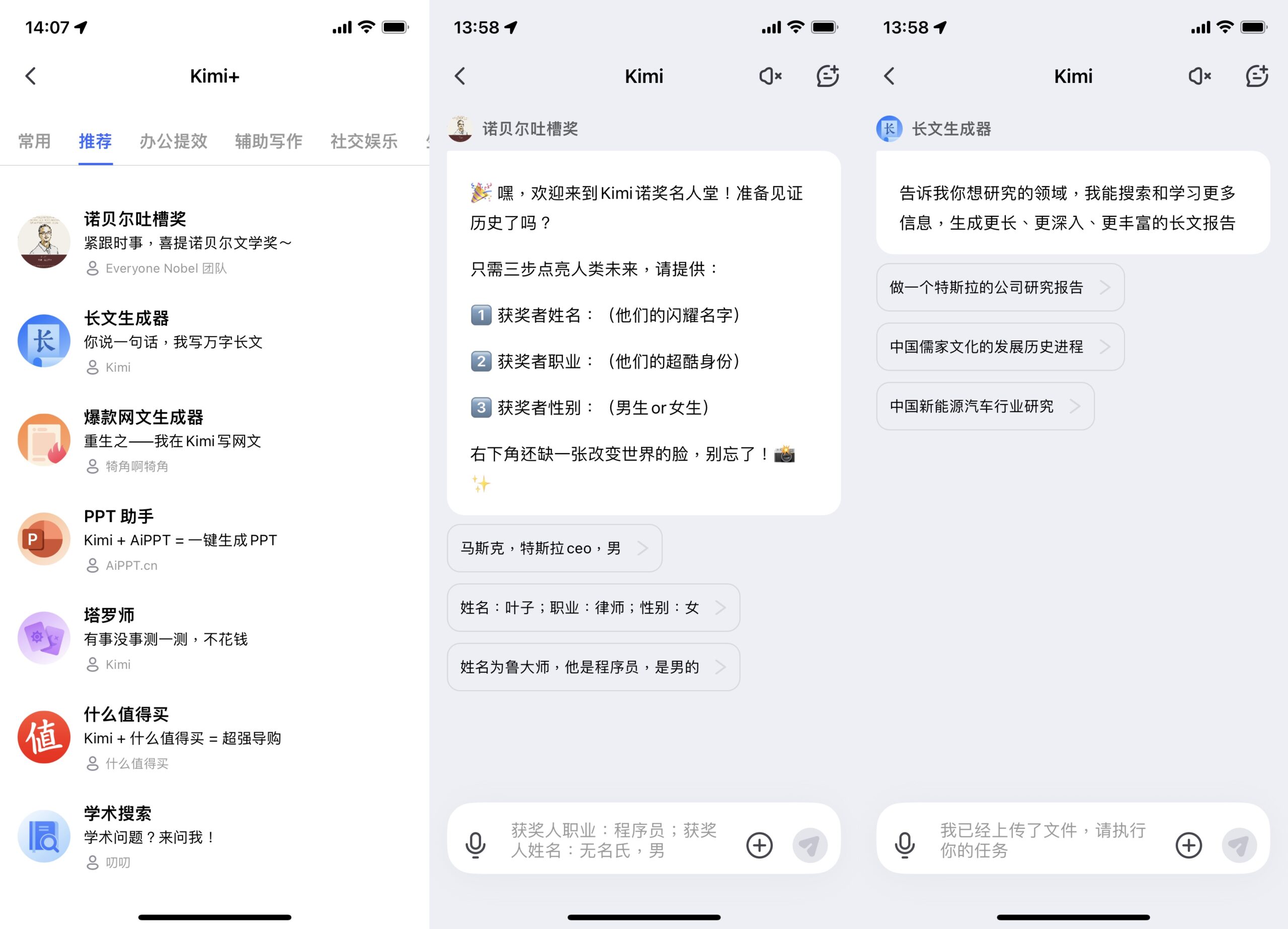Kimi 中供给多个智能体(官方称作“Kimi+”)供用户运用,包含上文咱们试用的小红书爆款生成器,PPT 帮手,以及学术查找、IT 百事通、论文写作帮手等东西,以及 i 人嘴替、诺贝尔吐槽奖等文娱向东西。想信跟着时刻的推移,Kimi 还会上线更多 AI 智能体,进一步完善用户的 AI 运用场景。