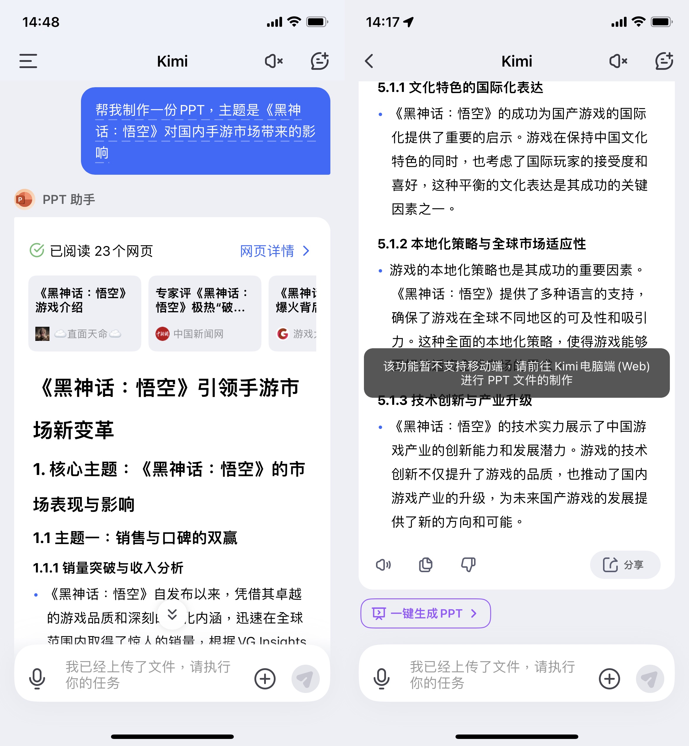 咱们试着让 Kimi 生成主题为“《黑神话:悟空》对国内手游商场带来的影响”的 PPT,它很快就给出了全体结构与对应的填充内容。不过需求留意的是,App 端暂不支撑生成 PPT,须转到网页端进行生成、进一步修改等操作。终究承认结束后可直接下载 PPT,整个进程完全免费。