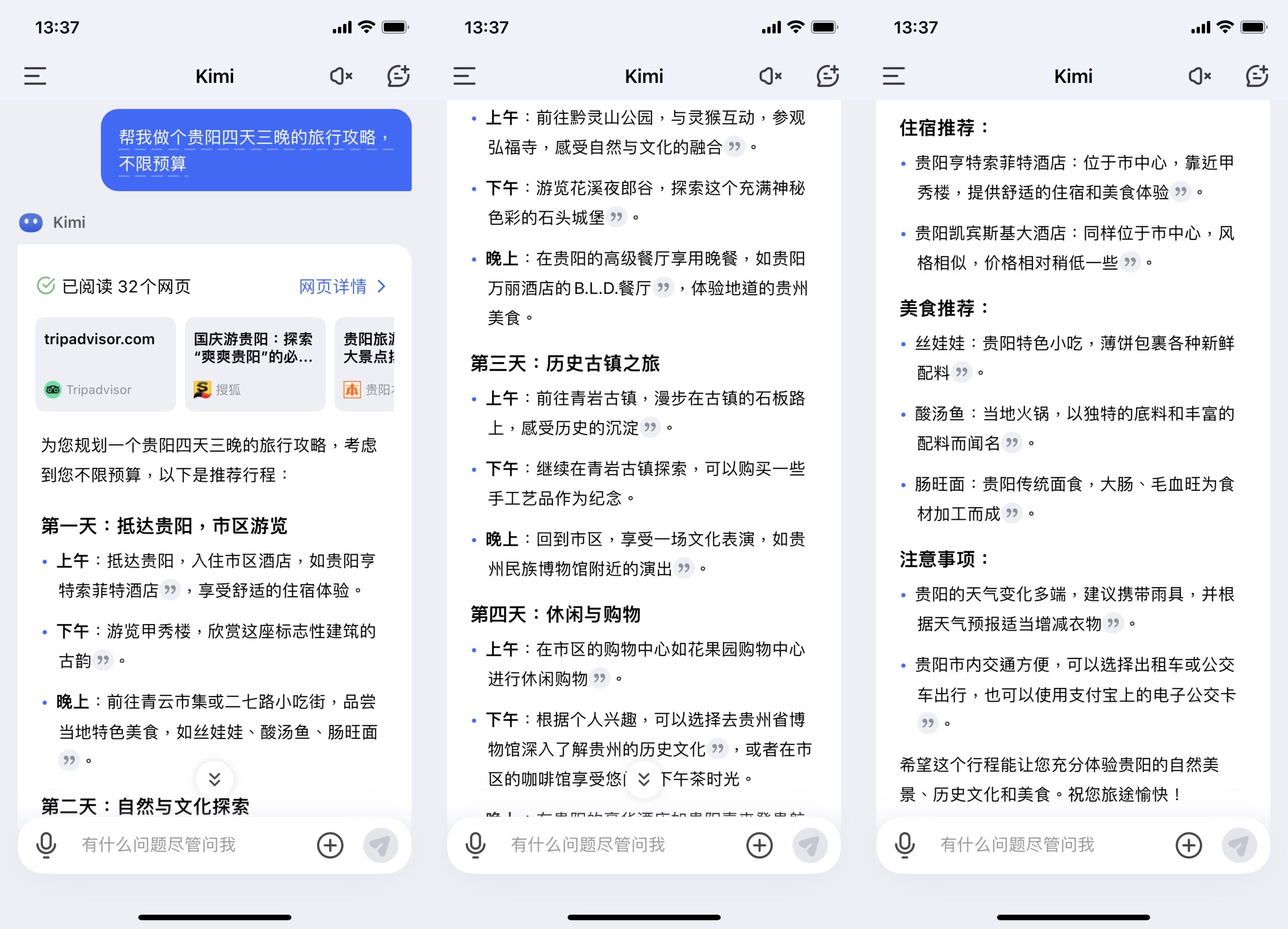 Kimi 的界面简练直观,操作起来十分便利。呼应速度也很快,通常在几秒钟内就能给出答案。此外,Kimi 还支撑多种输入方法,如文本、语音、图片,极大地便利了用户。